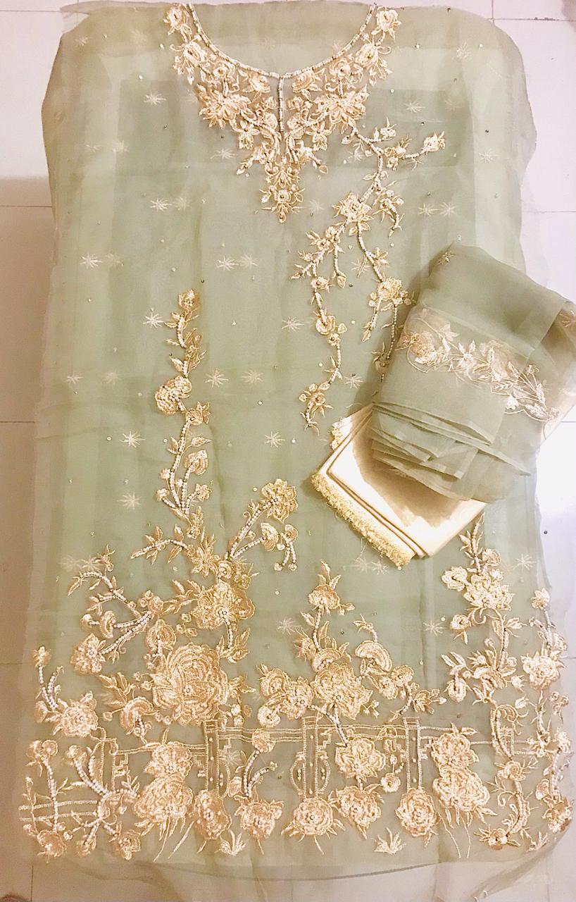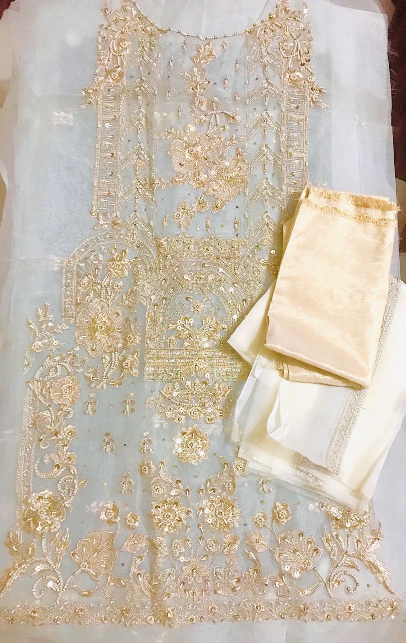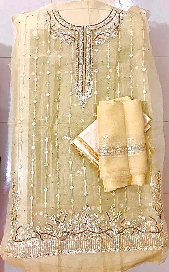 ORIGINAL PAKISTANI BENCHMARK ORGANZA COLLECTION.UNSTICHED 3PCS COLLECTION. FULL BODY KARCHUPI WORK. LIGHT YELLOW COLOR KAMIZ WITH SILVER WORK .GOLDER LIGHT PRINT WORK SALOWER AND SILVER EMBROIDERED ORNA. ORGANZA FABRIC. BEAUTIFUL PARTY WEAR.